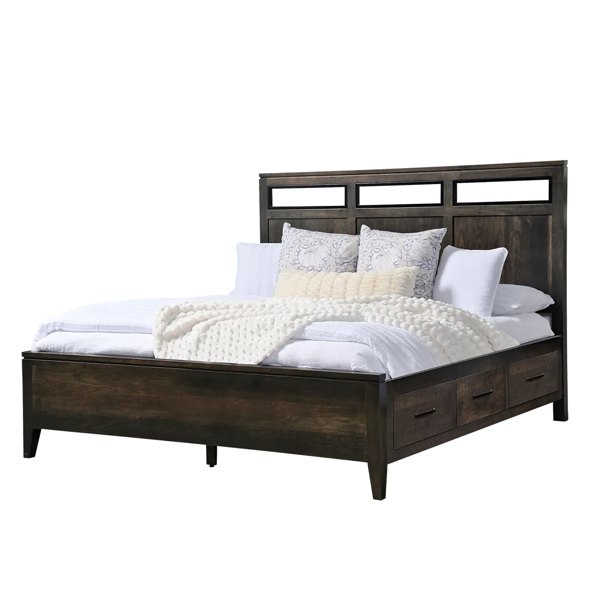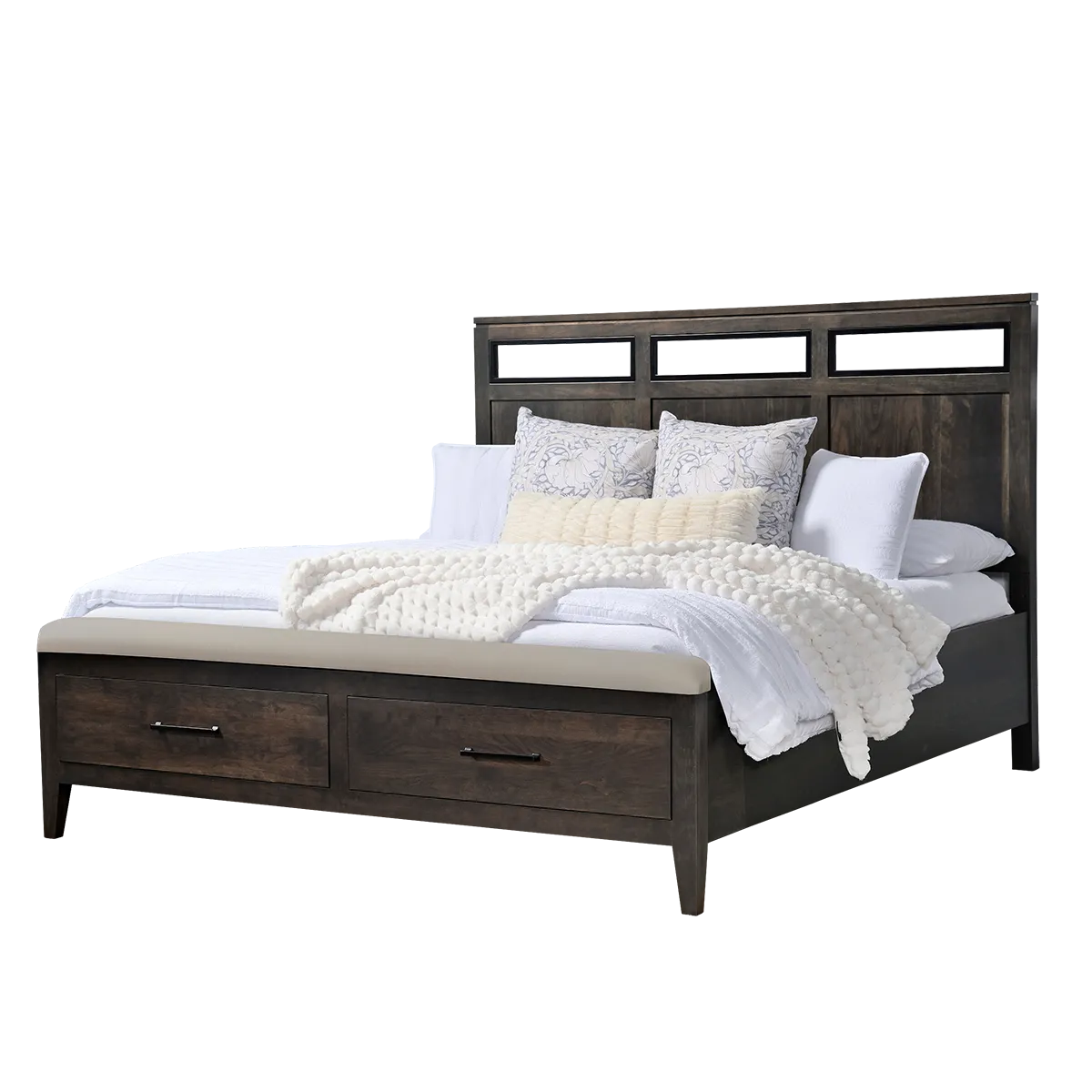 Choose your bed configuration—including standard, footboard storage bench, or raised drawer units—then select your preferred wood species, hardware, and finish from over 100 paints and stains.
